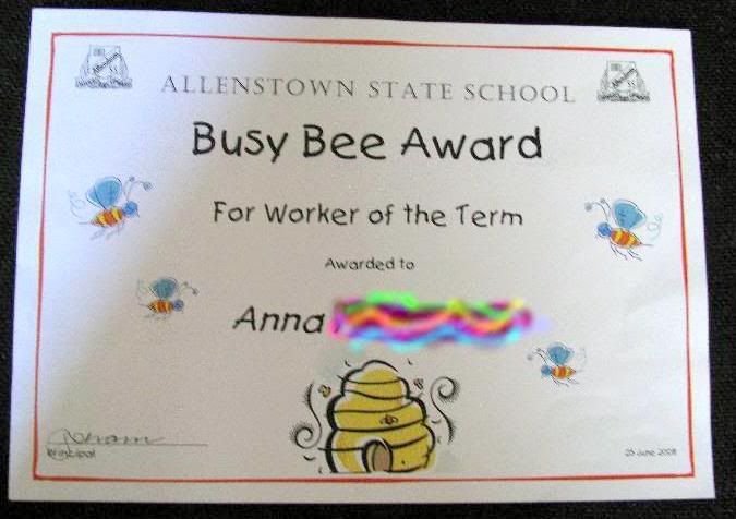Hoy me pidieron que me quedara en el colegio porque le iban a dar un premio a Anna. Dije que ya se lo habían dado, y me dijeron... no otro.Tres premios por clase: al mejor trabajador (o busy bee-abeja trabajadora), al más super listo y brillante y al mejor compañero (buen vecino)