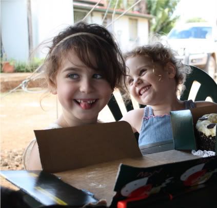 Era el cumple 39 de Kath y de paso, celebramos el cumple de Anna que es el jueves. Estaba Jeff, que vino de visita la semana pasada, los padres de Doug, los chicos de Kath, Neil y nosotros. Las chicas se lo pasaron como indias, como siempre. Jugaron softball, corrieron detrás de las gallinas, investigaron, treparon arboles y jugaron con los primos. La madre de mi cuñado hizo un curry de langosta y gamba que estaba impresionante. Jamas (JAMAS) comí algo tan delicioso, tan que uno quiere tirarse en la olla y matar a cualquiera que se acerque. Impresionante.